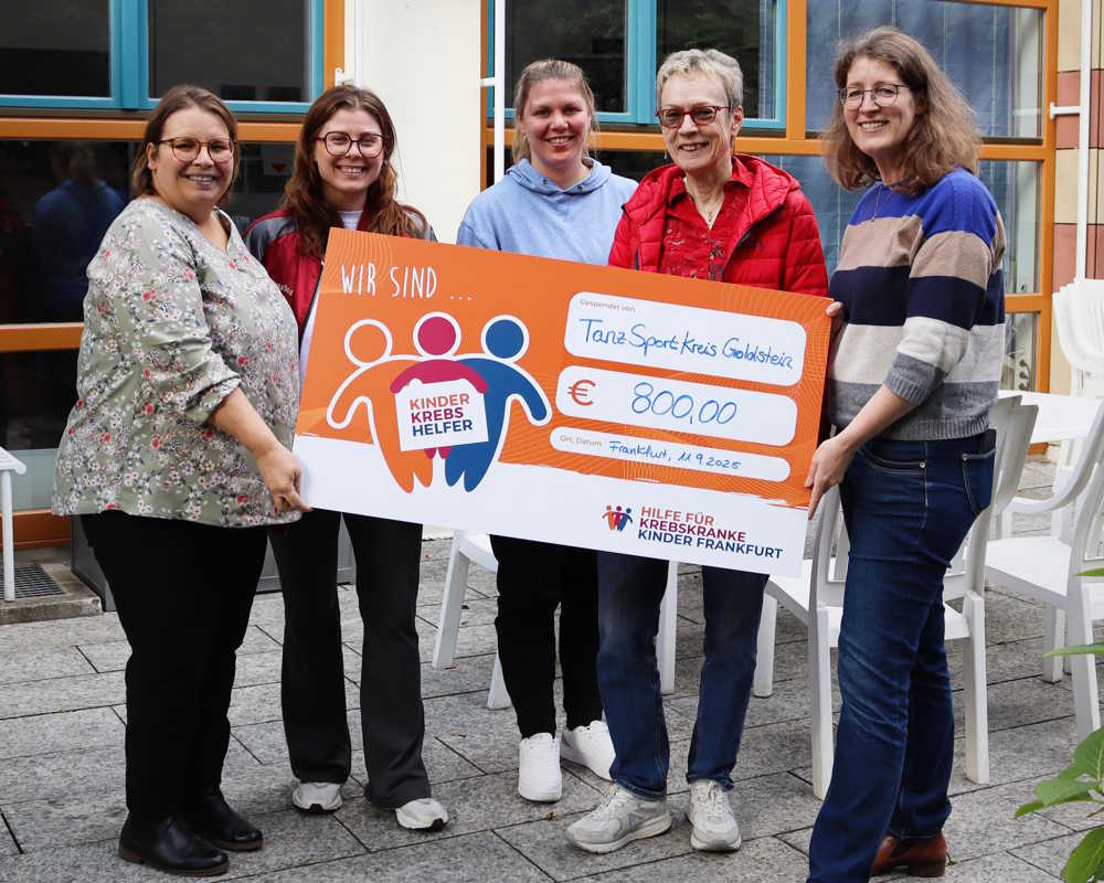 Bei Tanzveranstaltungen und Bällen haben Mitglieder und Gäste des TanzSportKreis Goldstein fleißig gespendet, und so kam ein stolzer Betrag zusammen. Dieser wurde nun dem Verein „Hilfe für krebskranke Kinder Frankfurt e.V.“ an der Uniklinik Frankfurt übergeben.
